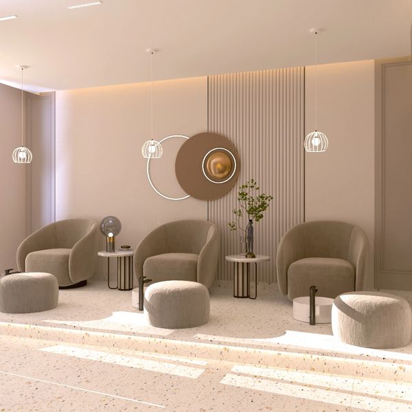 A serene and inviting nail spa designed for ultimate relaxation. Soft neutral tones, warm lighting, and elegant textures create a calming atmosphere, while thoughtfully curated seating enhances comfort. Every detail is crafted to offer a seamless blend of luxury and tranquility, ensuring a refined self-care experience.